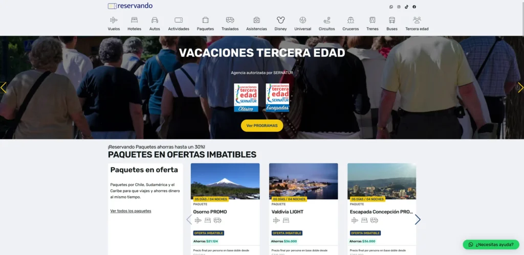 Ofrece venta online de vuelos, hoteles, cruceros, paquetes turísticos, actividades, tickets Disney, tickets Universal, pasajes en bus, billetes de tren, circuitos, renta de autos, traslados y está autorizada por el Sernatur para comercializar los paquetes del programa Vacaciones Tercera Edad en sus modalidades Clásico y Escapadas.